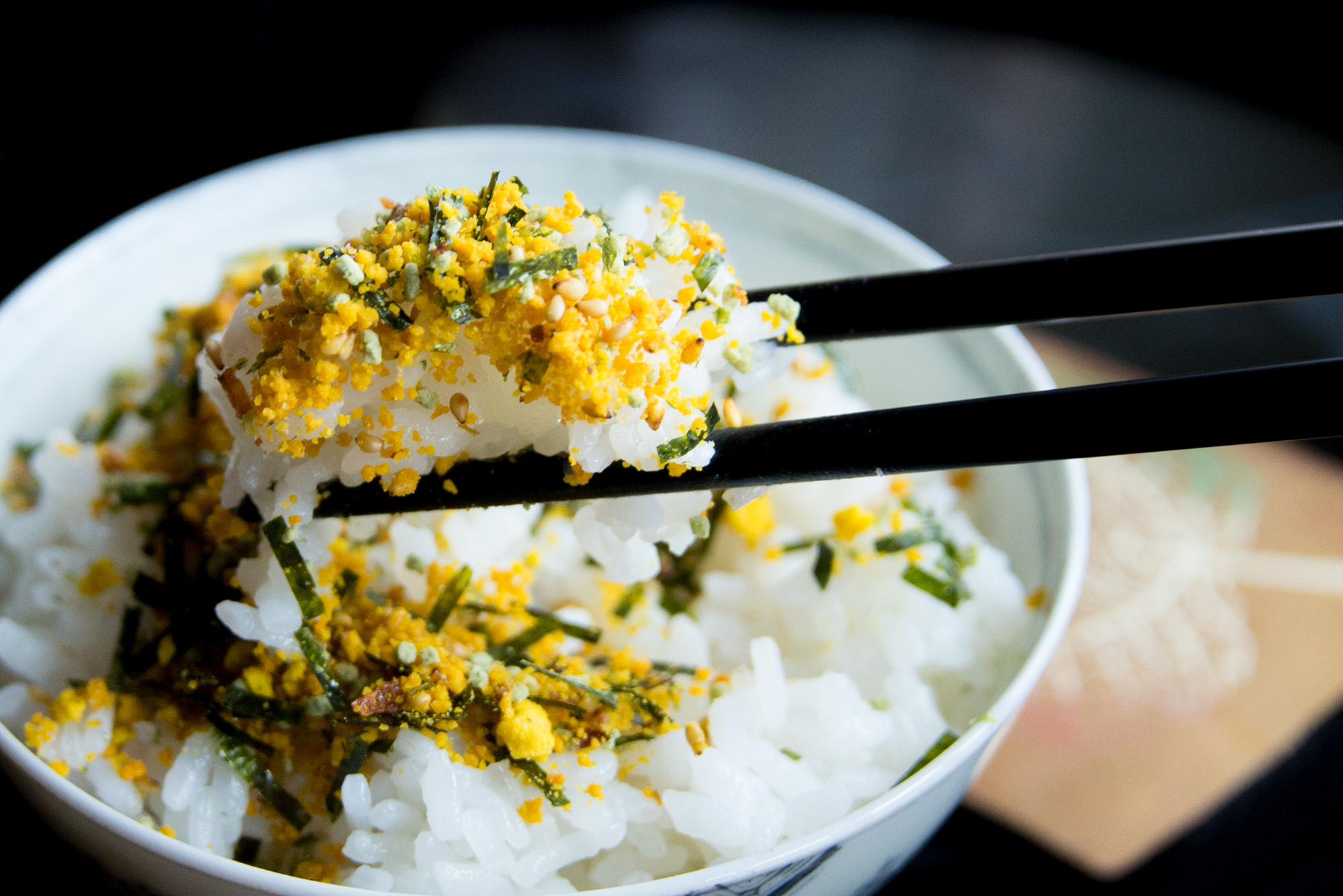 2016年9月撮影のフリー写真素材114です。ふりかけご飯を箸でつかんで撮影しました。