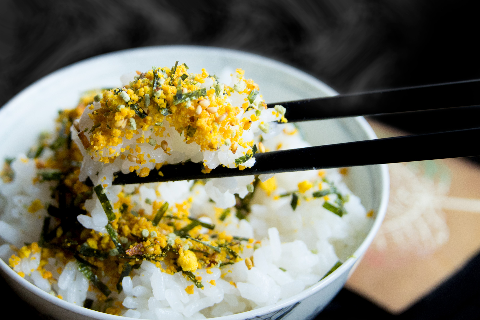2016年9月撮影のフリー写真素材115です。ふりかけご飯を箸でつかんで撮影して、編集で湯気を追加しました。