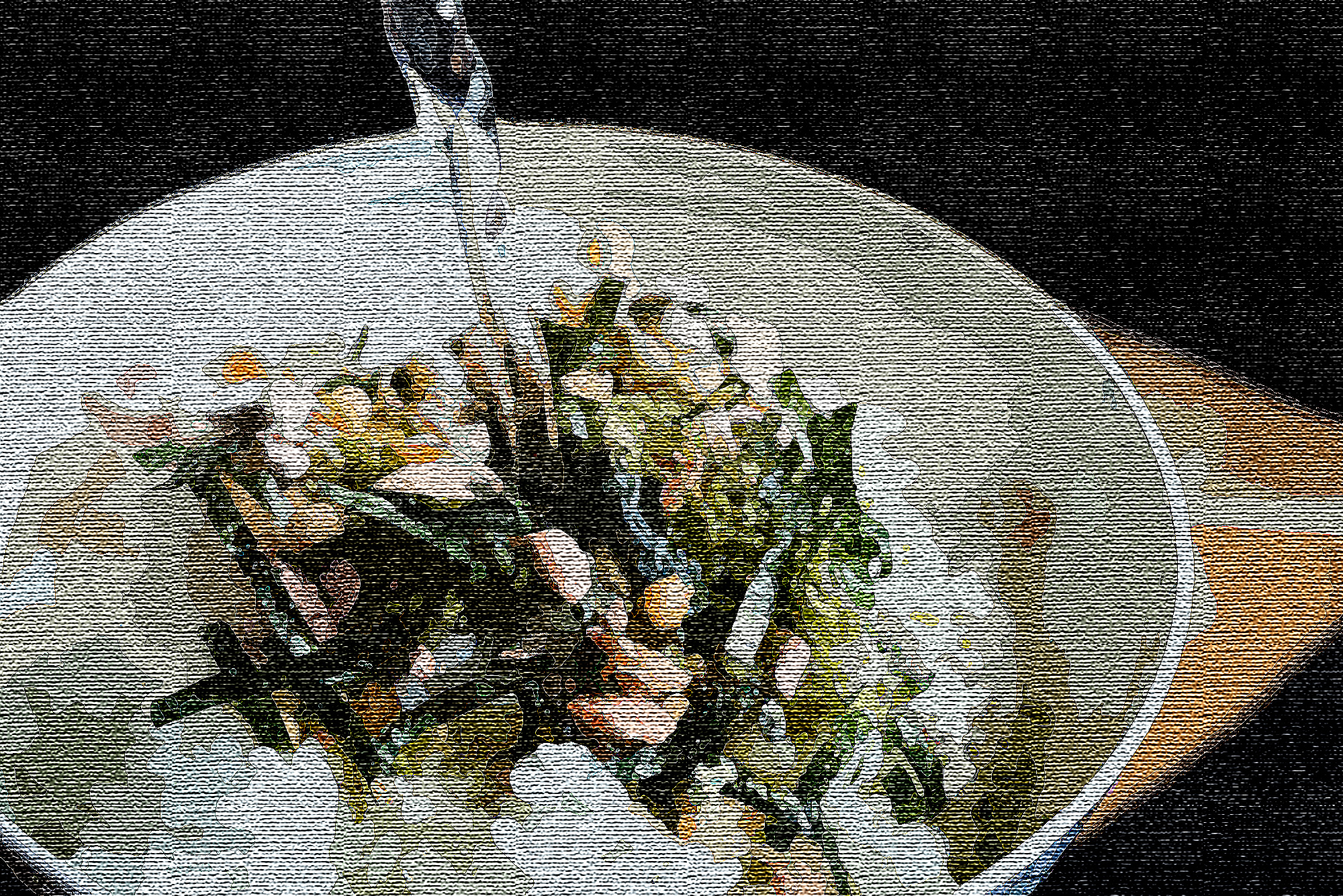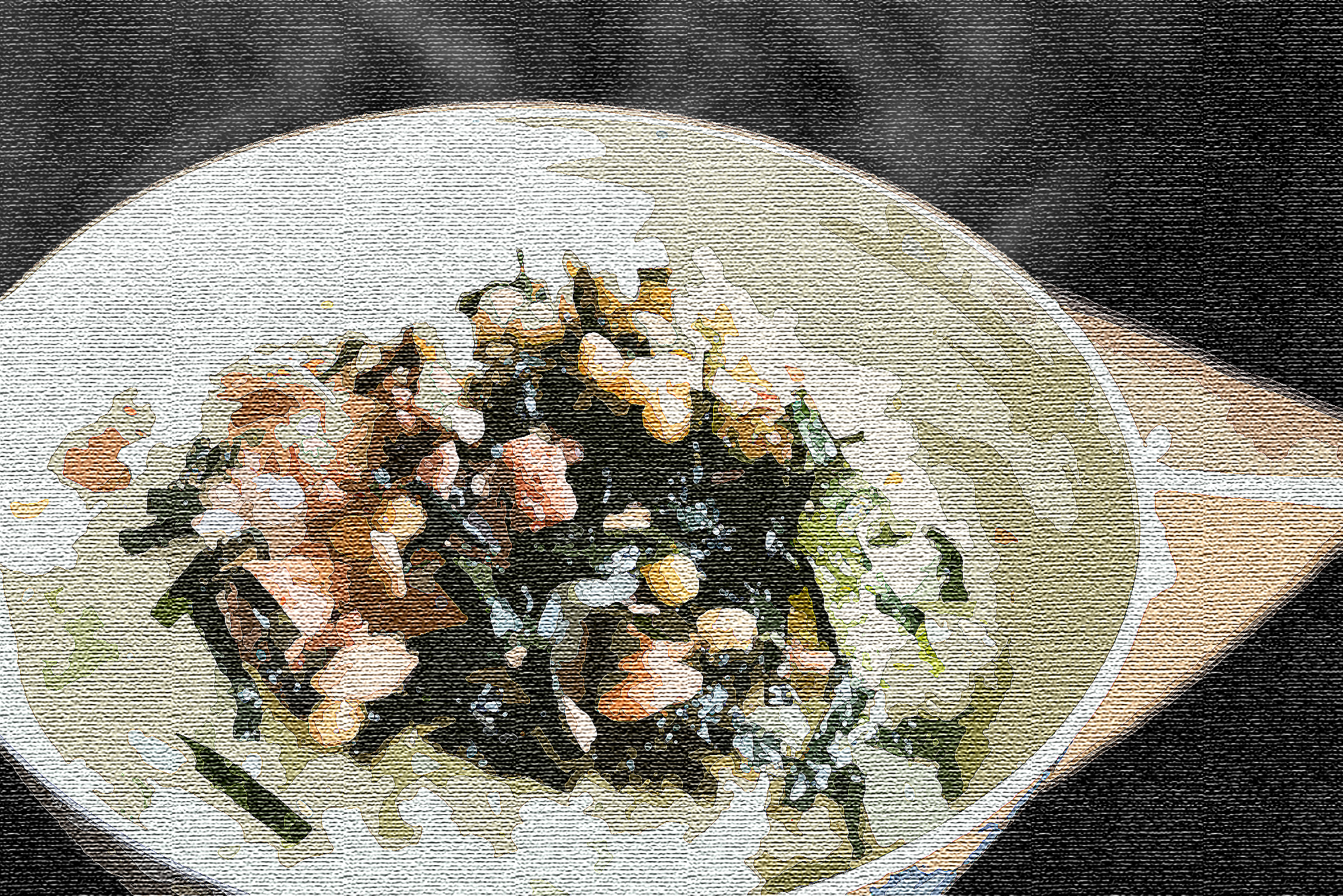 2016年9月撮影のフリー写真素材121です。お茶漬けの素にお湯を注いで撮影して、絵画風に加工しました。