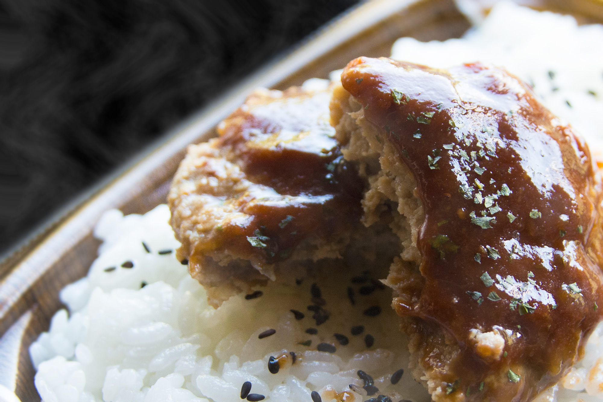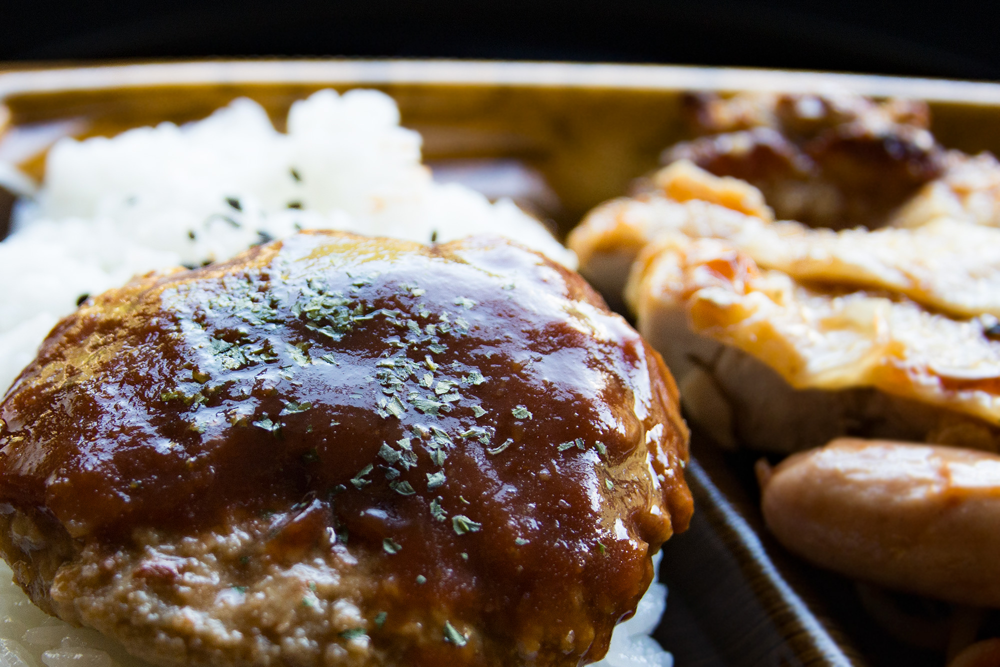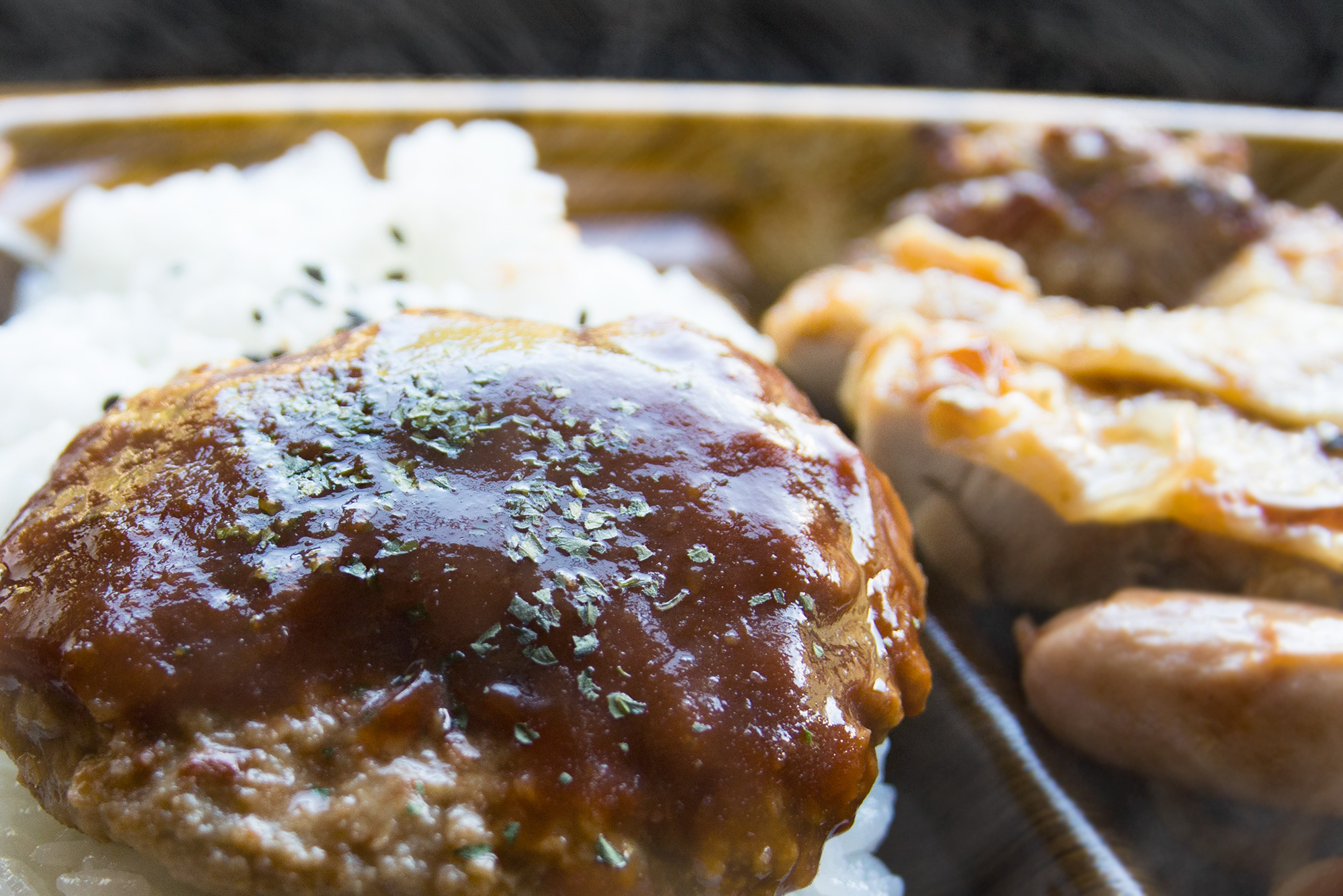 2016年9月撮影のフリー写真素材128です。お弁当のハンバーグを撮影して、編集で湯気を追加しました。