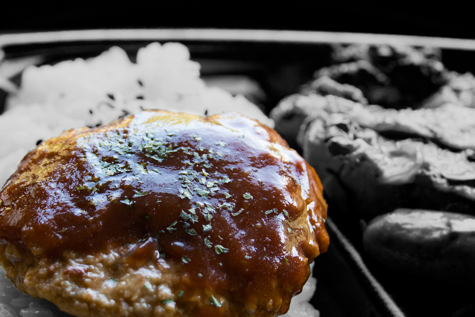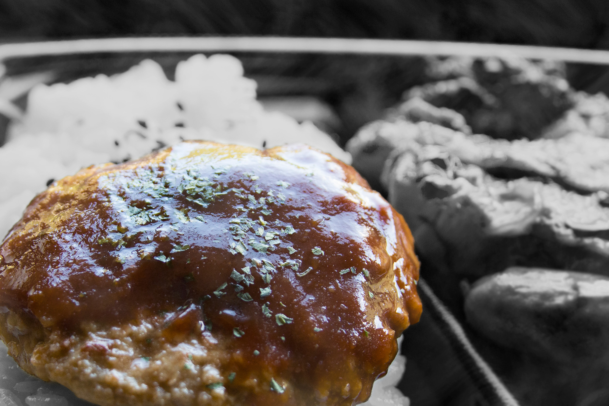 2016年9月撮影のフリー写真素材129です。ハンバーグを撮影して、ハンバーグ以外を白黒写真に編集しました。