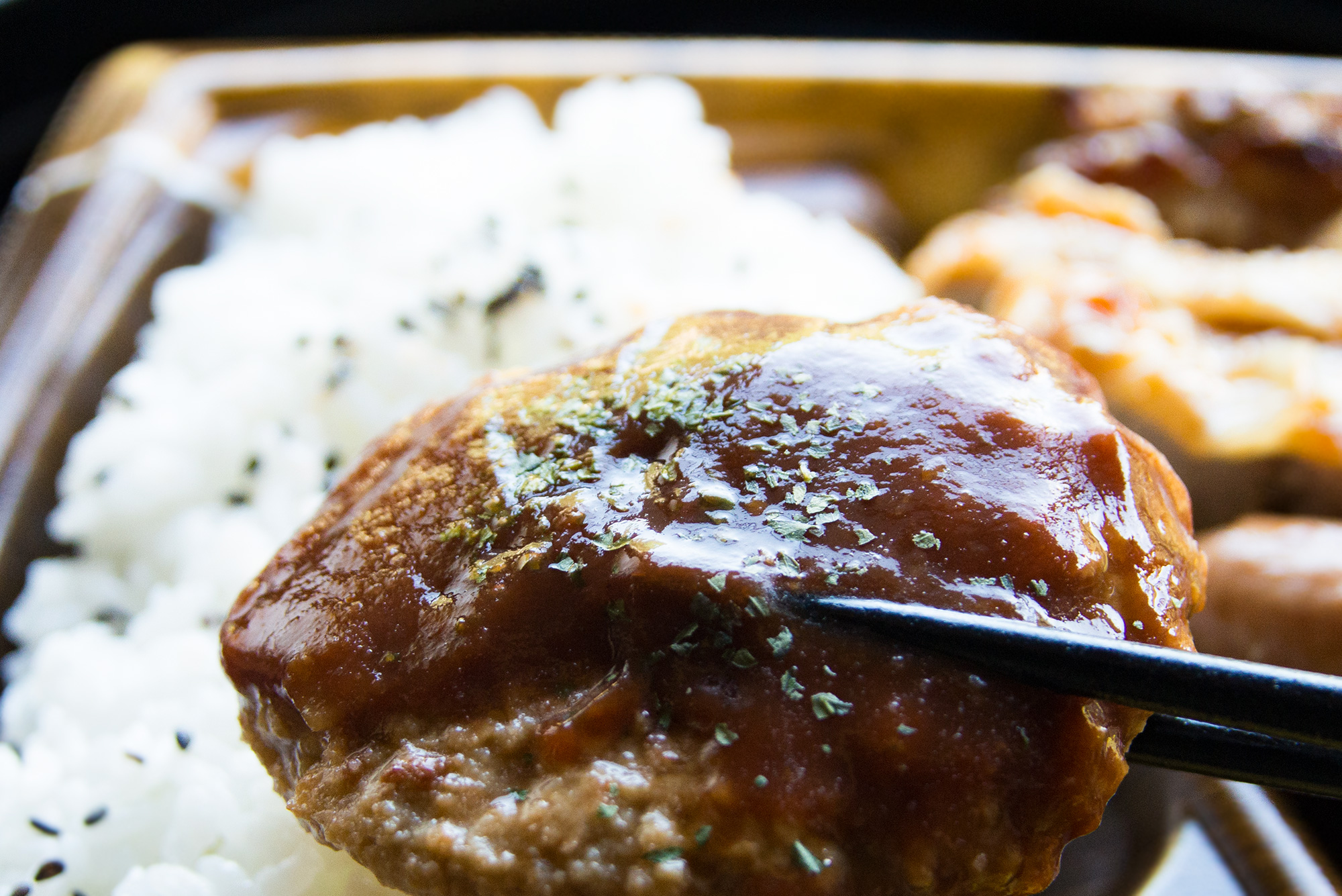2016年9月撮影のフリー写真素材141です。ご飯と一緒にハンバーグを箸でつかんで撮影しました。