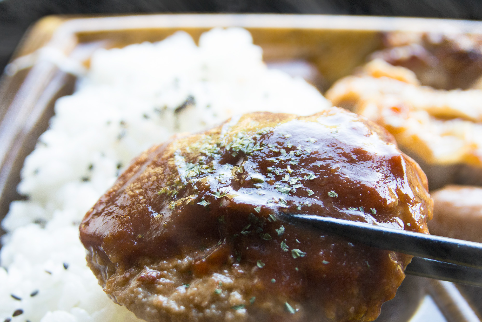 2016年9月撮影のフリー写真素材142です。ご飯と一緒にハンバーグを箸でつかんで撮影して、編集で湯気を追加しました。