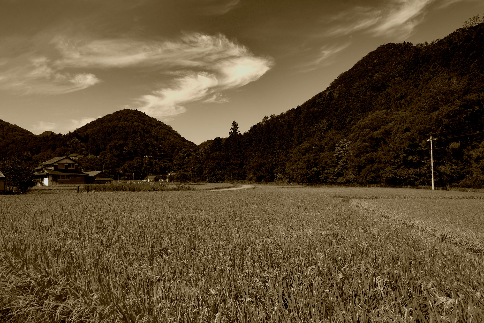 2016年9月撮影のフリー写真素材160です。田んぼを撮影して、セピア色に編集しました。