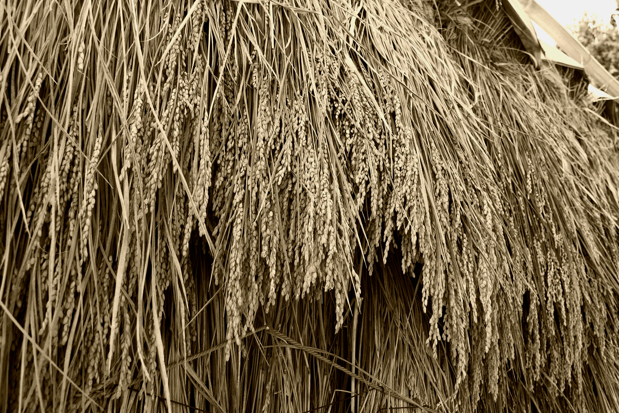 2016年9月撮影のフリー写真素材163です。干した稲を撮影して、セピア色に編集しました。
