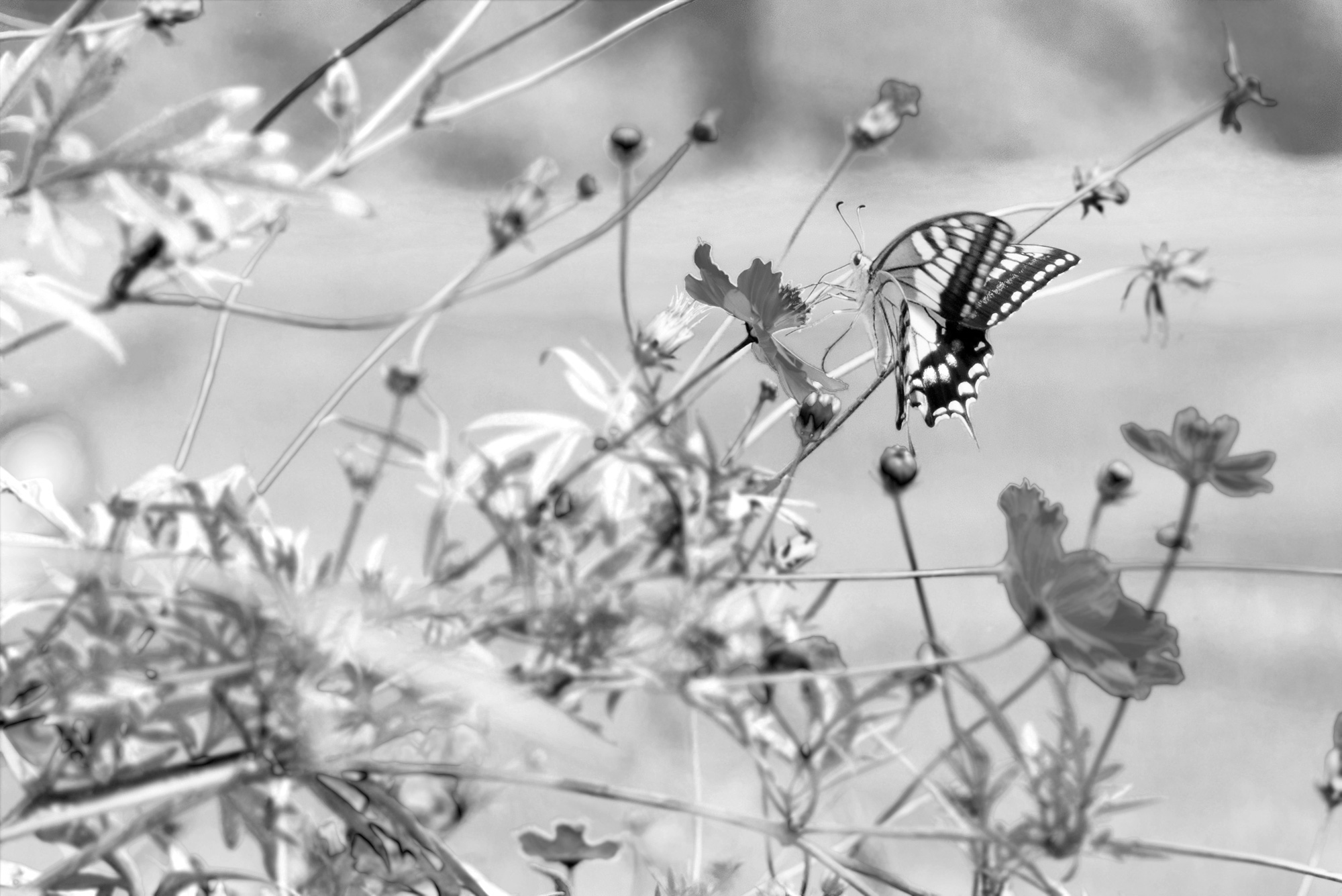 2016年9月撮影のフリー写真素材37です。蝶々を撮影して、白黒写真に編集しました。