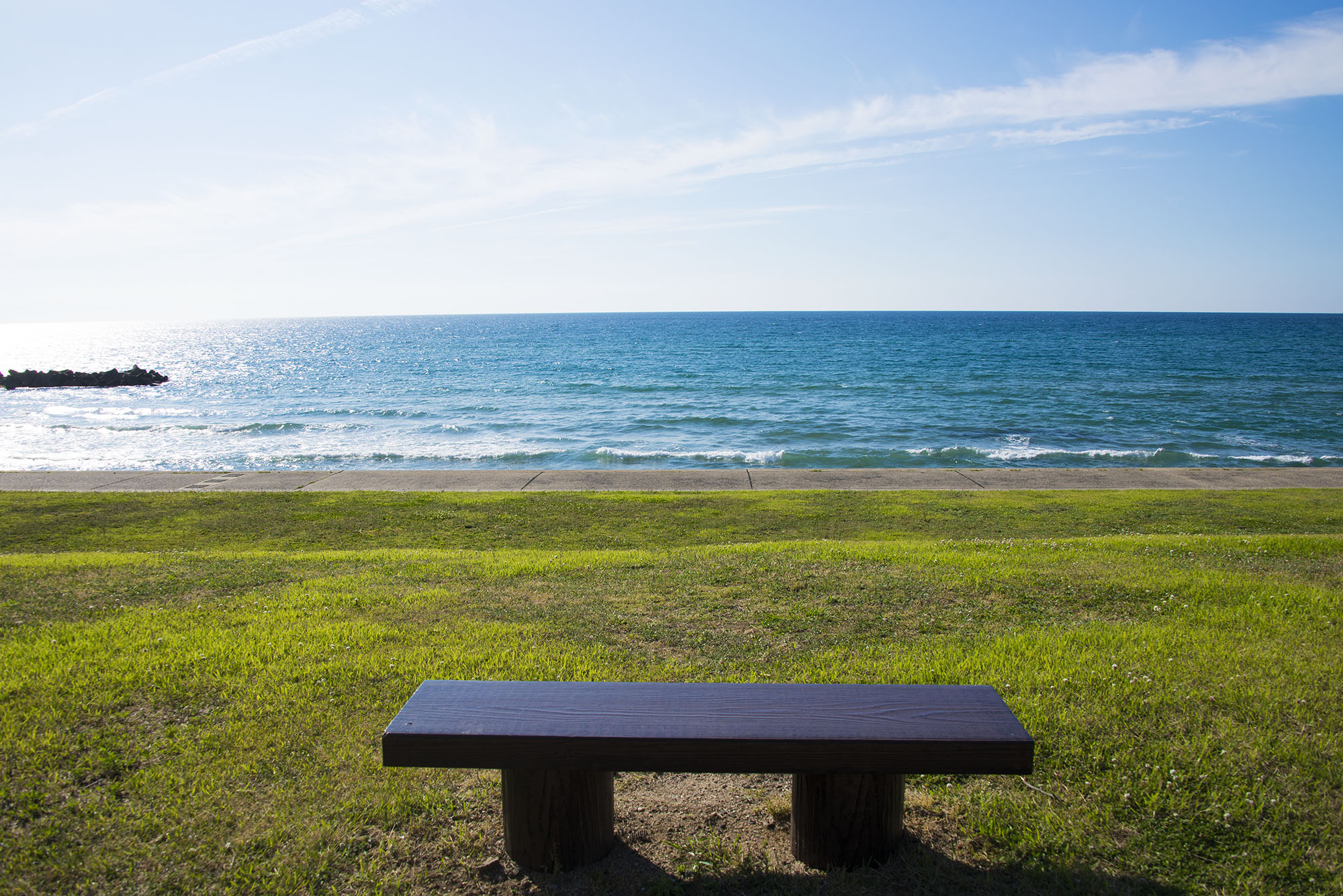 青い海と長椅子を撮影しました。2017年6月撮影のフリー写真素材124です。