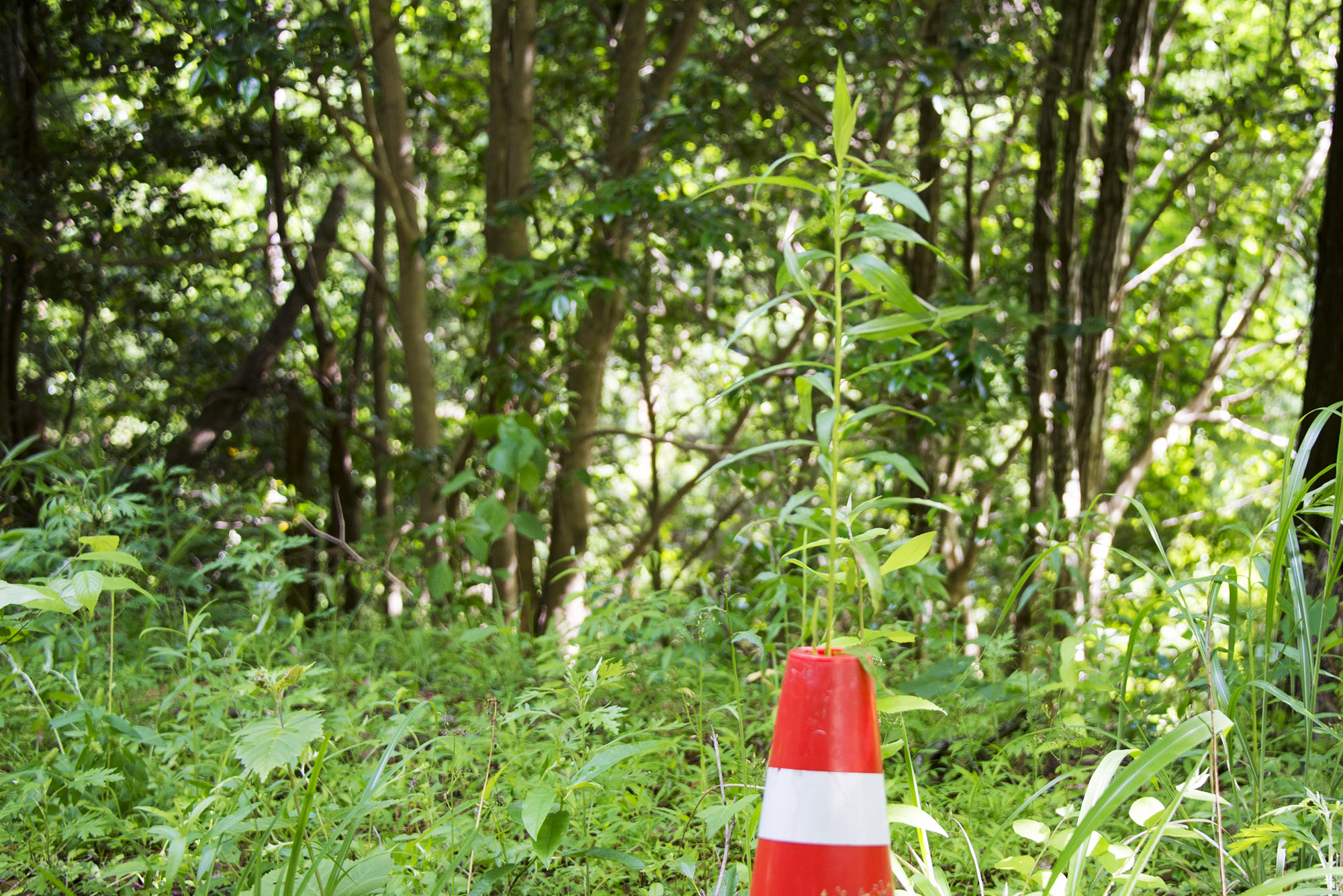 赤白のラバーコーンの中から生えた草を撮影しました。2017年6月撮影のフリー写真素材34です。