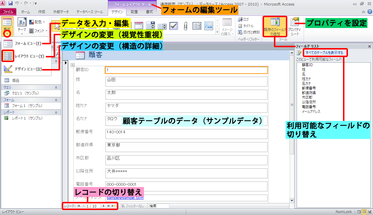 レイアウトビューとデザインビューでは、フォームのデザインを変更します。