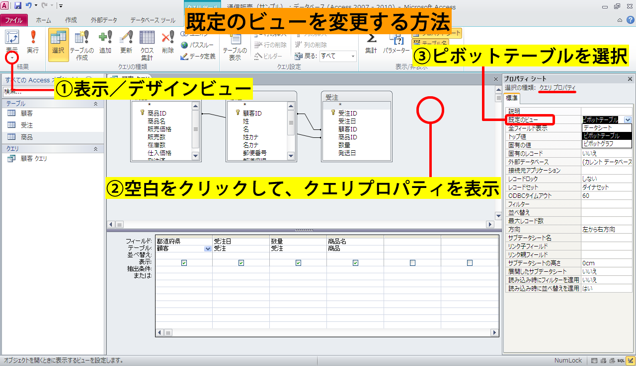 このクエリを、データシートビューではなくピボットテーブルビューで使用する場合は、既定のビューをピボットテーブルビューに変更しておくと便利です。