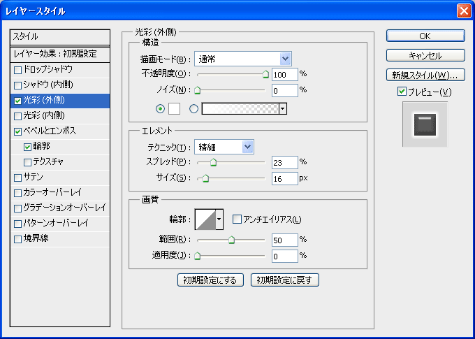 レイヤースタイルダイアログボックスの、光彩(外側)で周りの光を調整します。