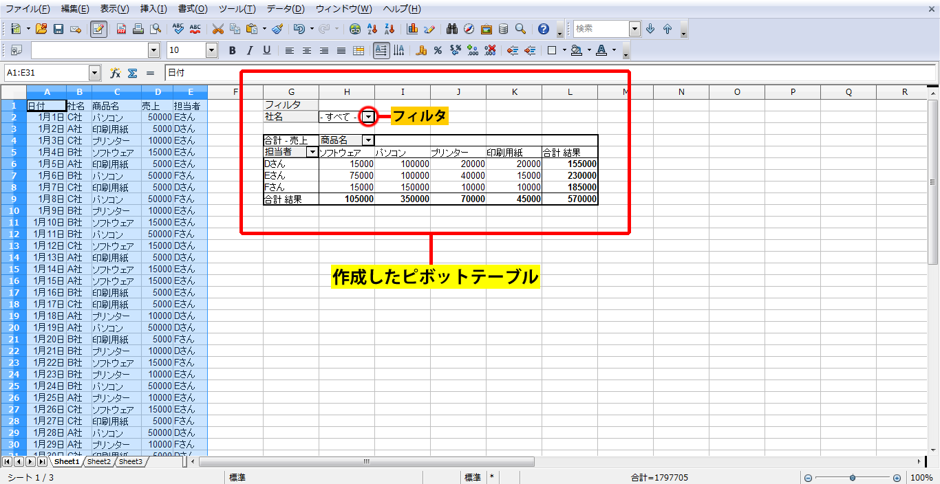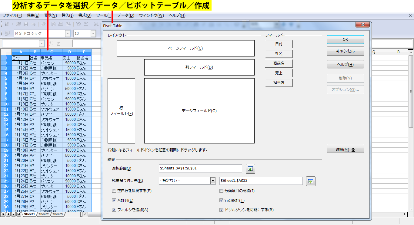 サンプルデータを使って、ピボットテーブルを作成します。