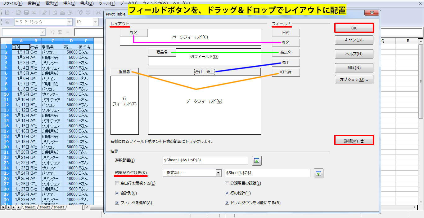 ここでは、ページフィールド「社名」/行フィールド「担当者」/列フィールド「商品名」/データフィールド「売上」という配置にしました。
