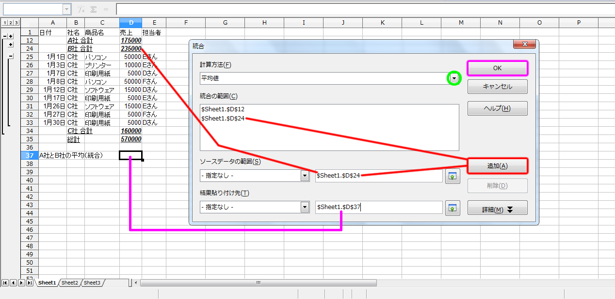統合ダイアログボックスの OK をクリックすると、結果の貼り付け先に計算結果が追加されます。