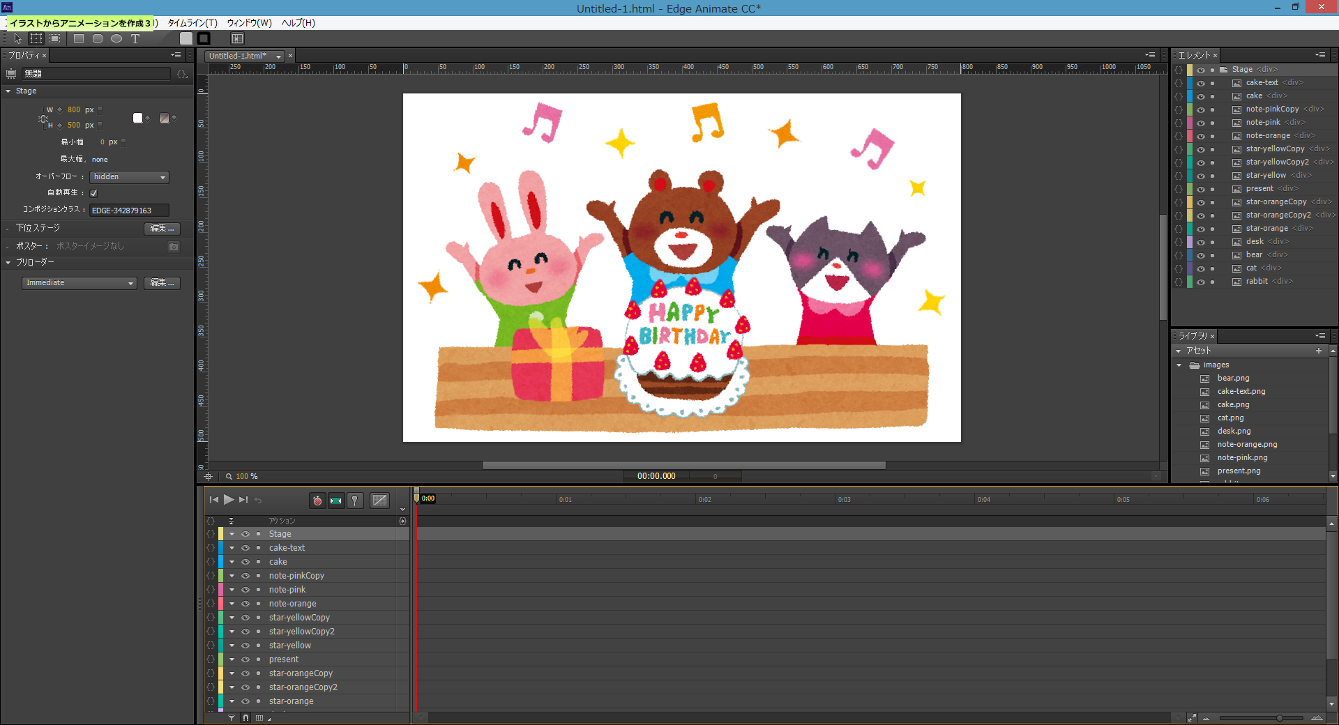 上の画像のように、Adobe Edge Animate CC のステージに、分割したイラストを配置しました。