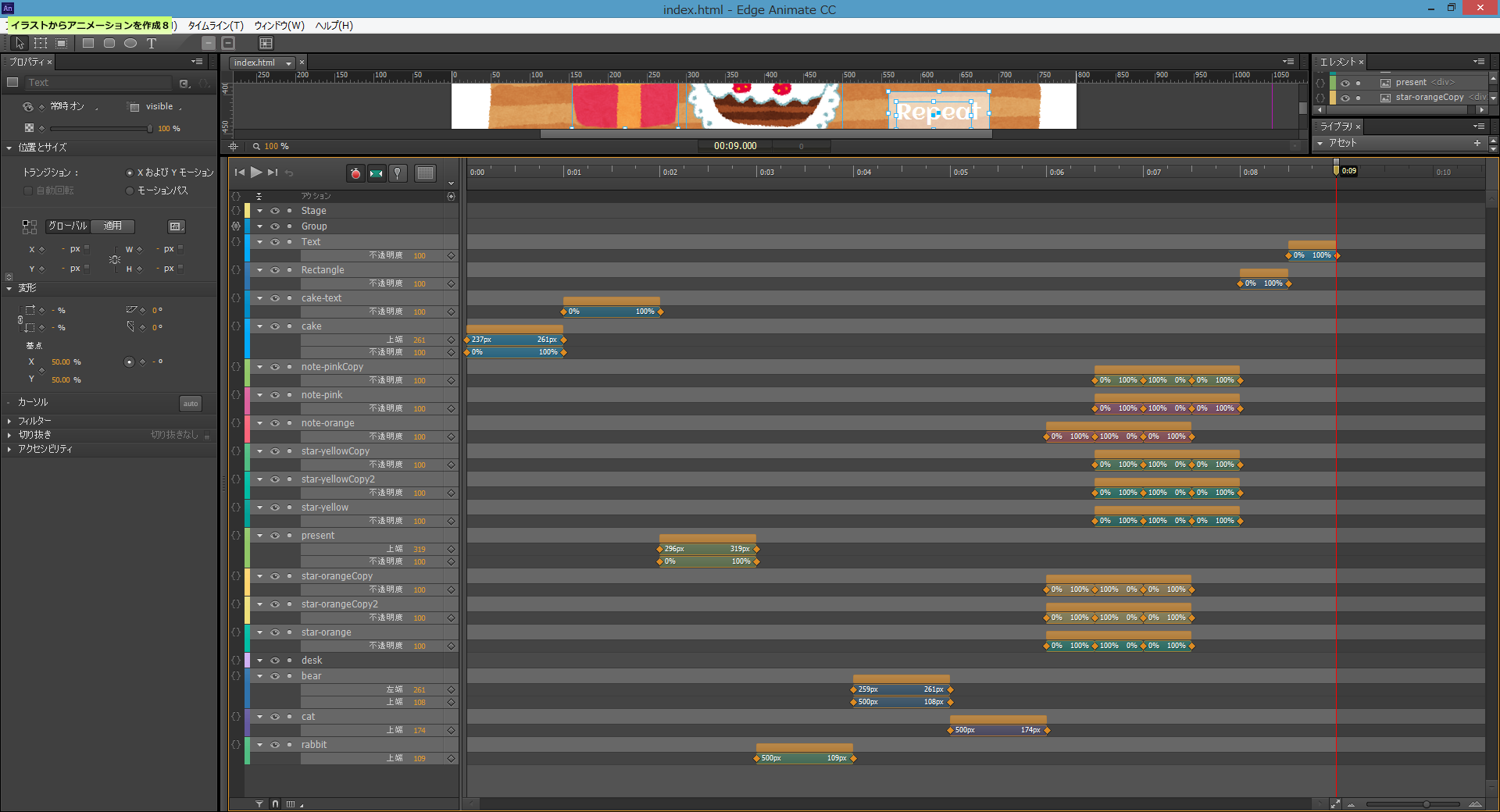 エレメントパネルで重ね順を変更しながら、イラストと同じようにステージに並べます。