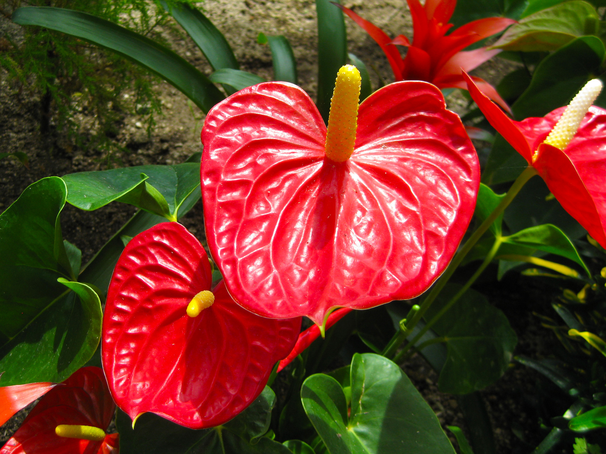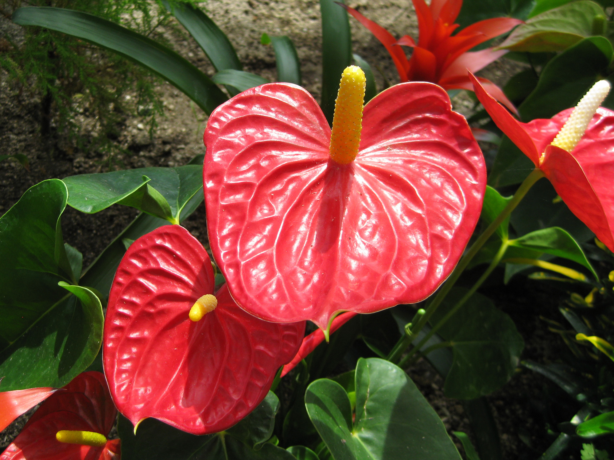 別名「紅団扇(べにうちわ)」です。花言葉は「飾らない美しさ」です。サトイモ科です。