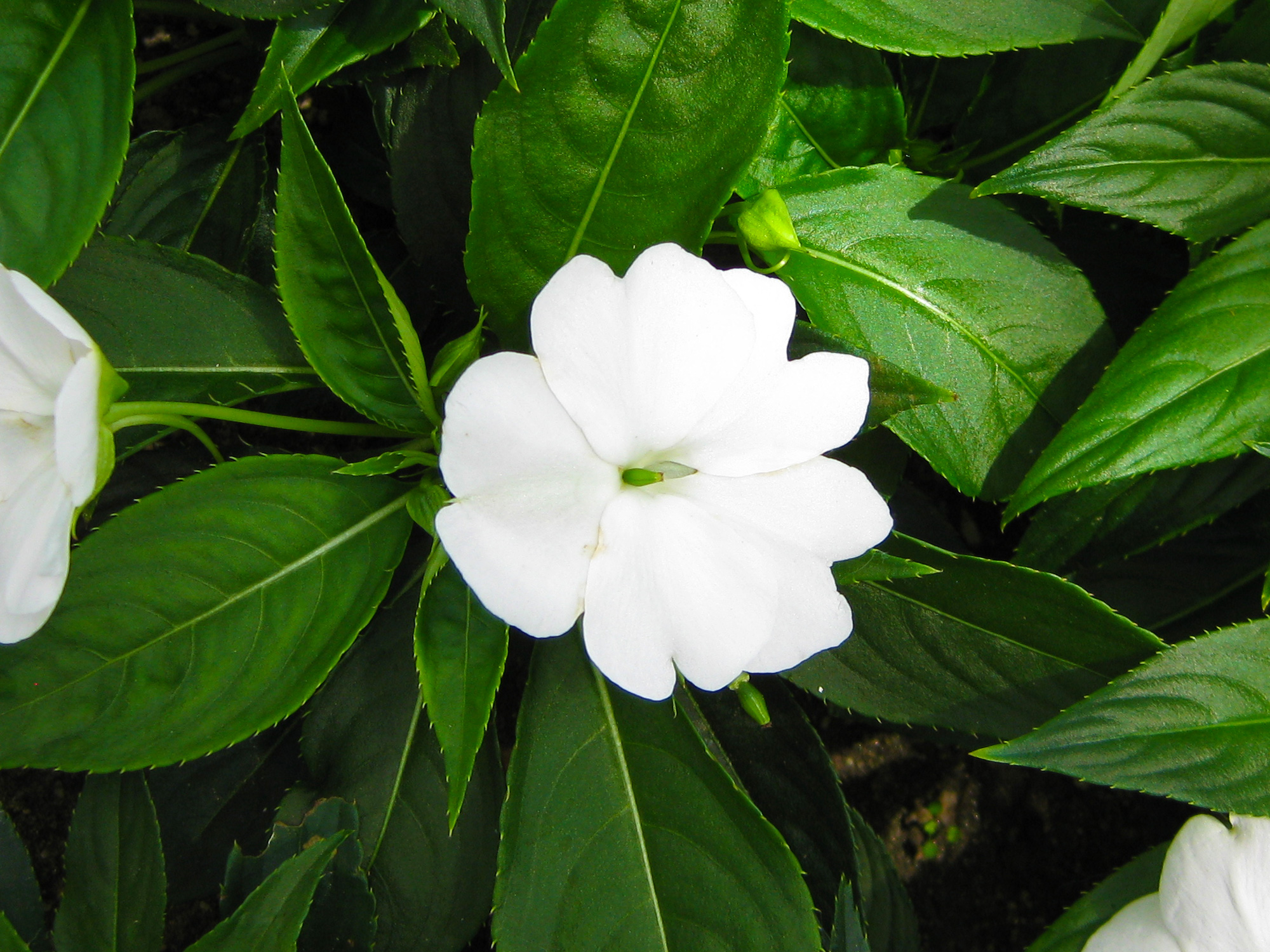 白色のニューギニアインパチェンスです。ツリフネソウ科の多年生植物です。