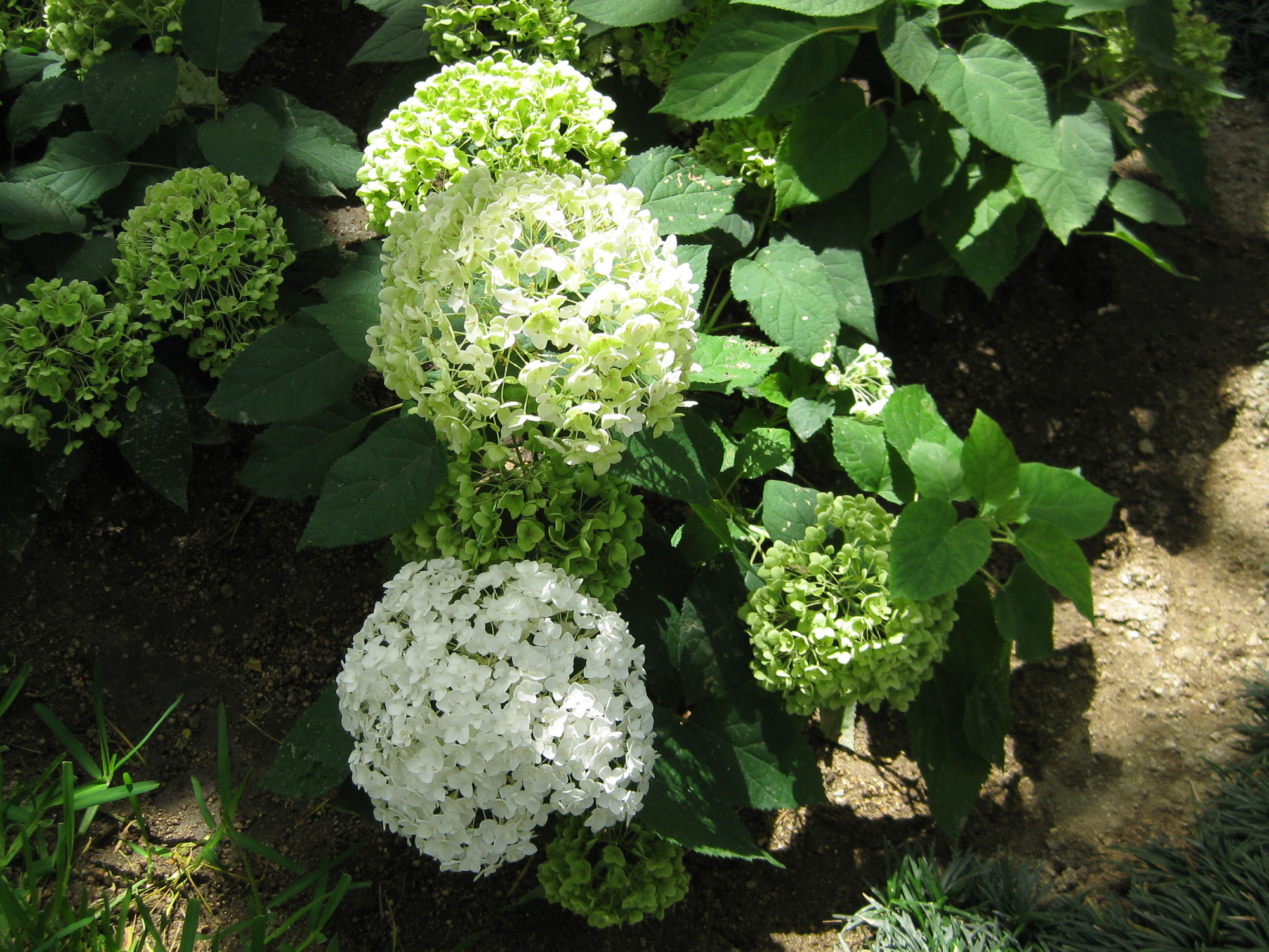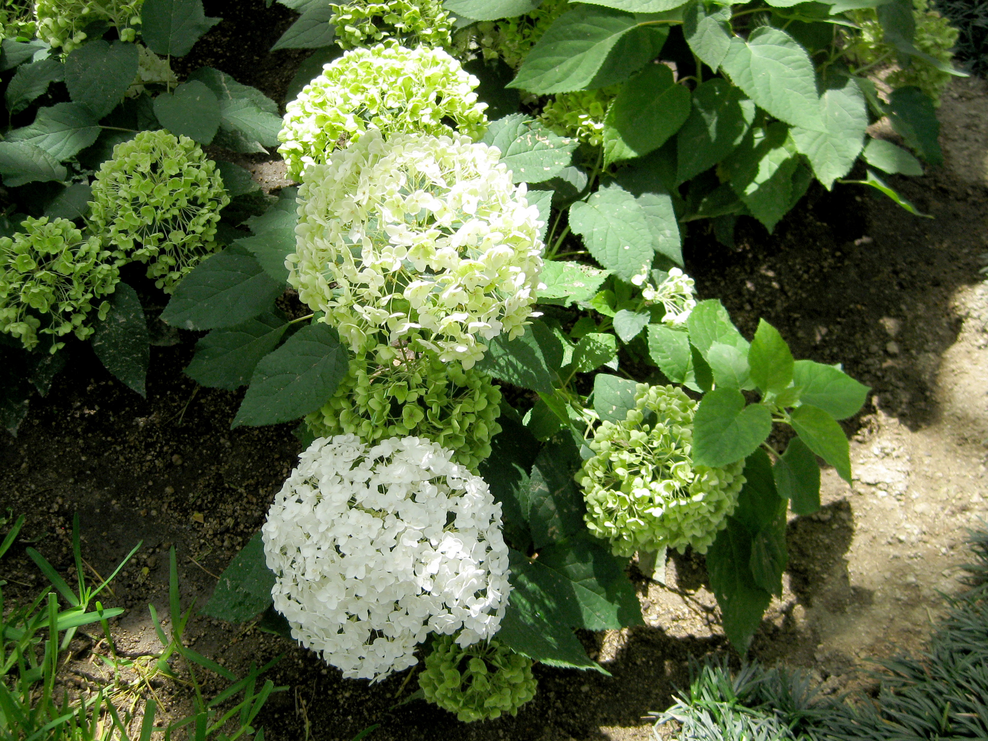アジサイ科のアナベルです。つぼみの頃は薄緑色で、開くにつれて真っ白になります。