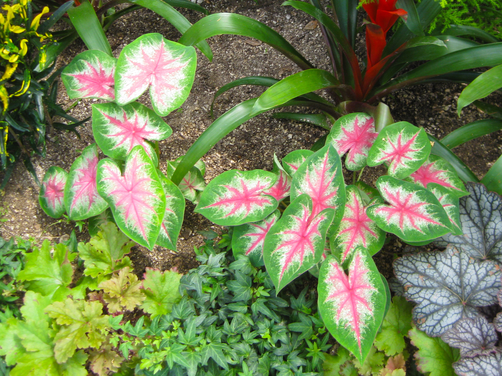 薄い赤斑が綺麗なカラジウムです。サトイモ科の多年草です。原産は南アメリカです。