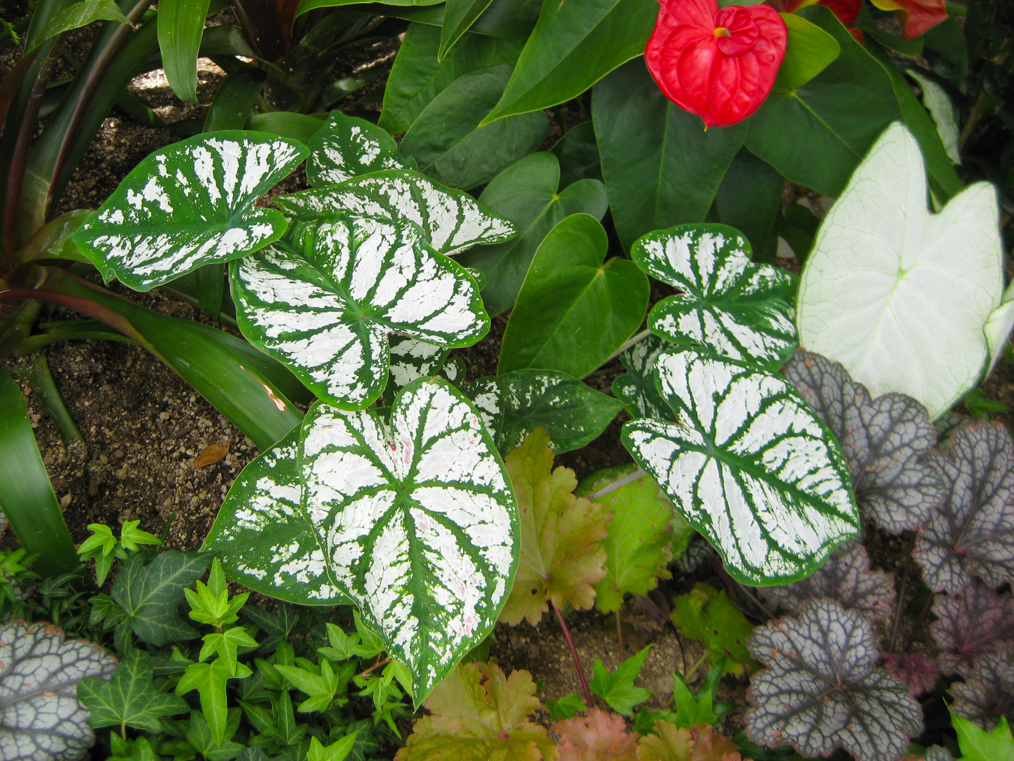 白斑が綺麗なカラジウムです。色調は、フォトショップで彩度を上げました。