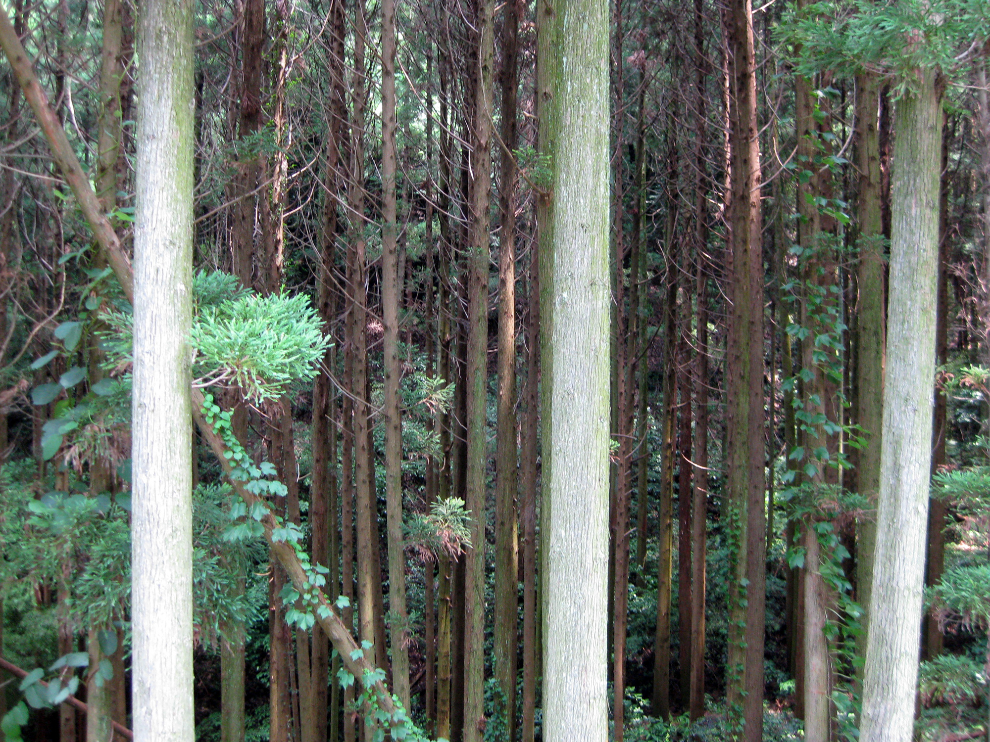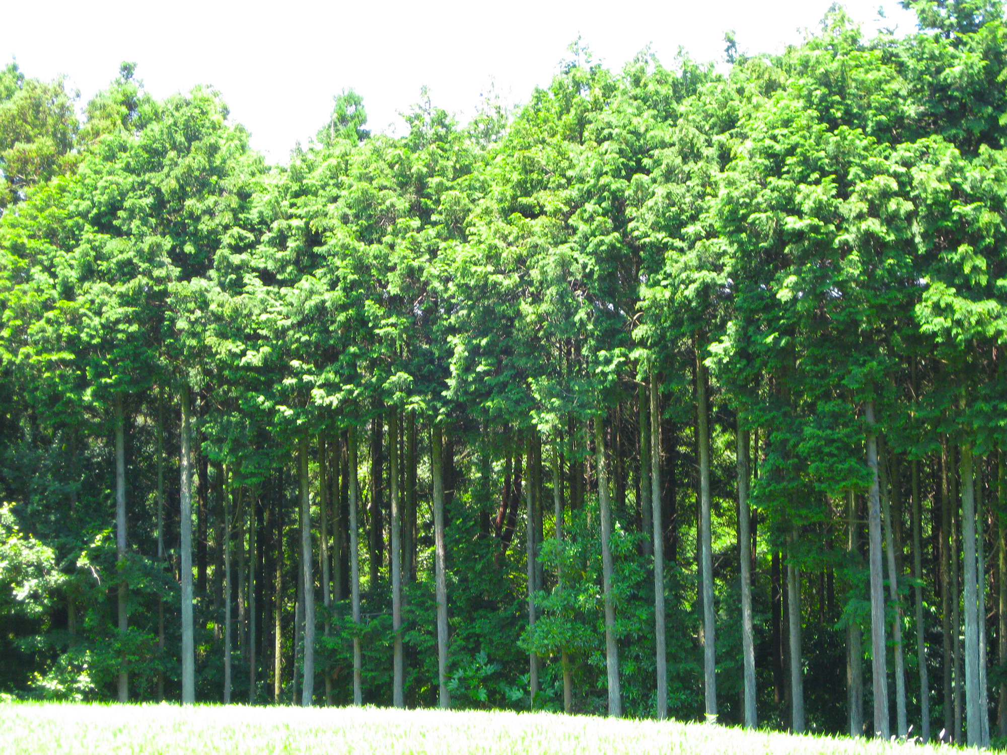 田んぼの奥の森林です。綺麗に真っ直ぐ立っています。