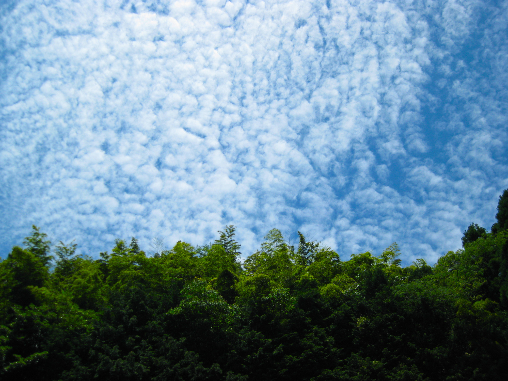 森と青空と雲です。緑と青空が綺麗な目に優しい写真です。雲の模様も綺麗です。