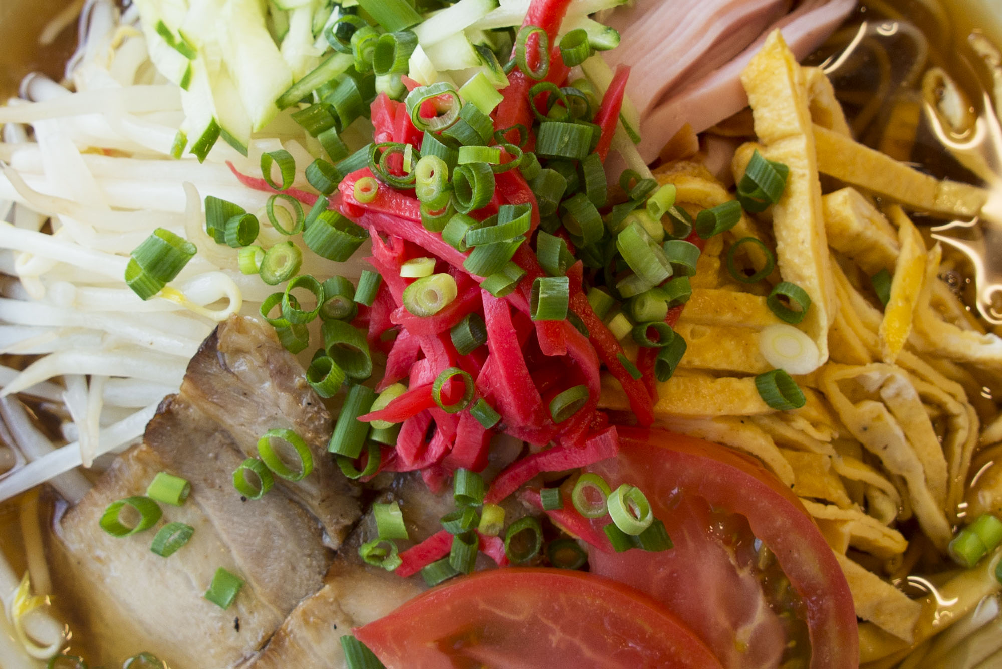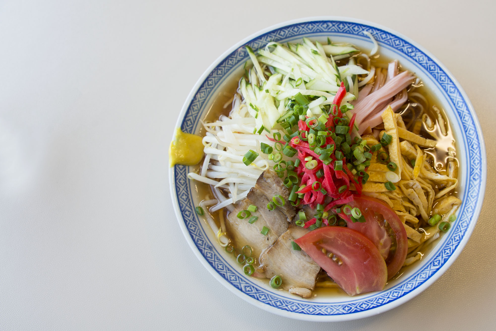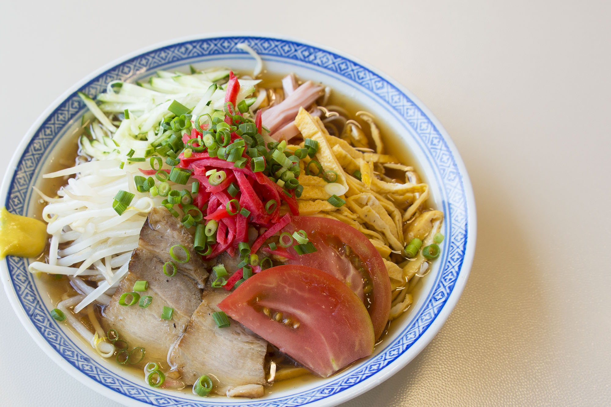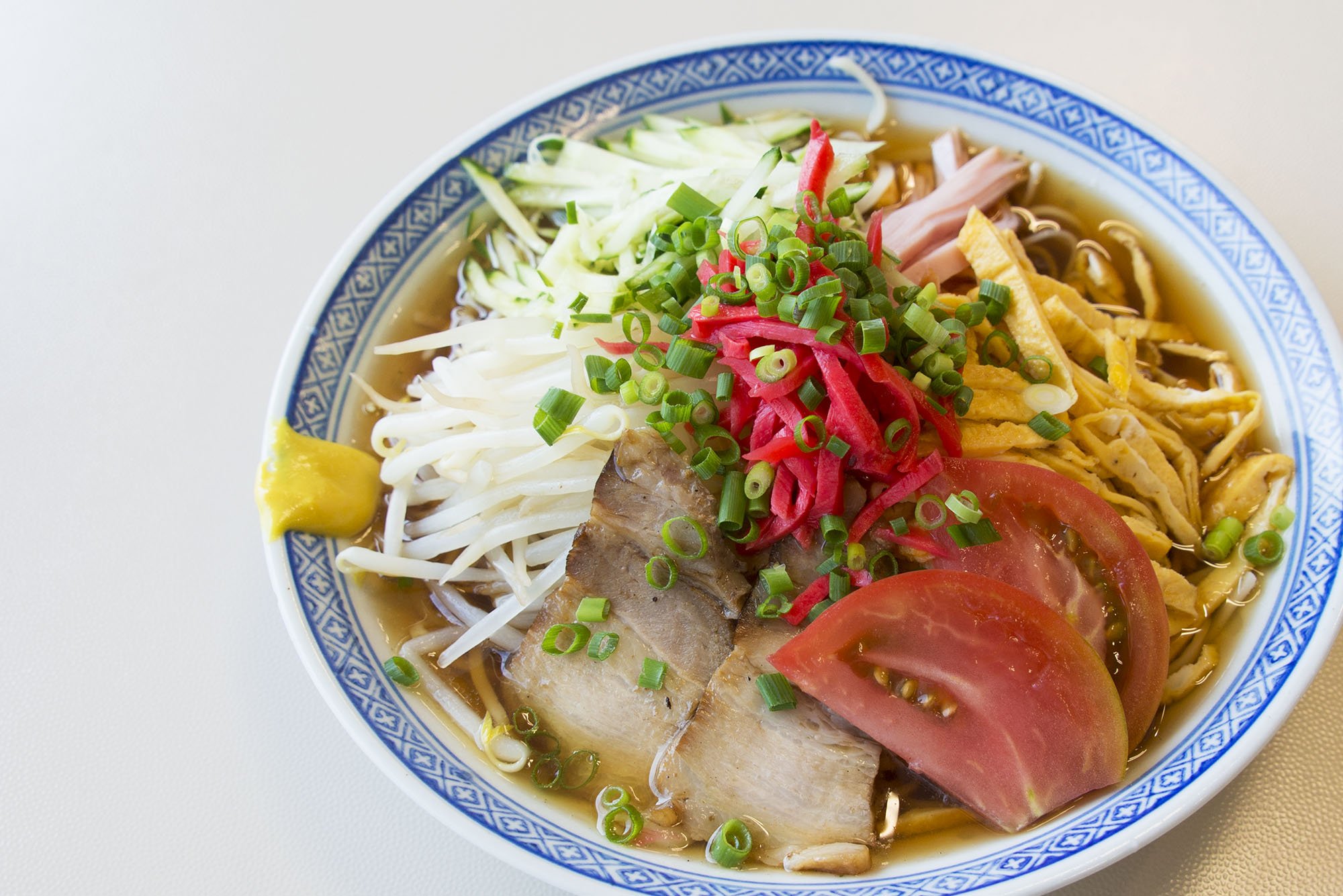 チャーシューをメインに冷やし中華を撮影して、右側に文字入れなどのスペースを空けました。フリー写真素材185です。