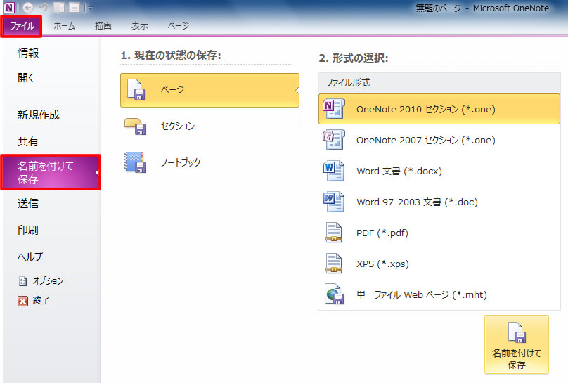 保存するファイル形式は、OneNote 2010 セクション/OneNote 2007 セクション/Word 文書/Word 97-2003 文書/PDF/XPS/単一ファイル Web ページ/OneNote パッケージから選択できます。