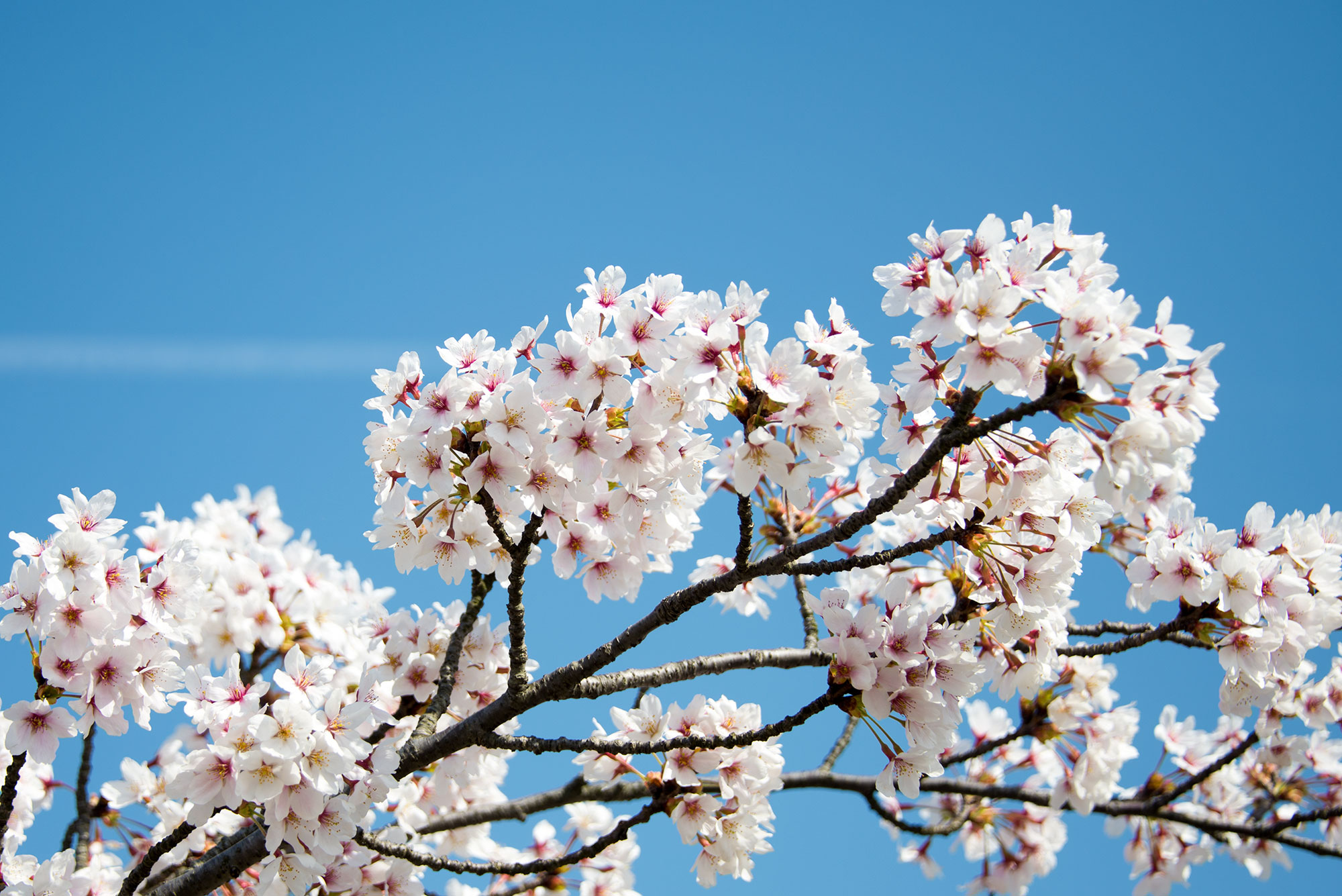 こちらも、桜の花と青空です。飛行機雲が少し写っています。