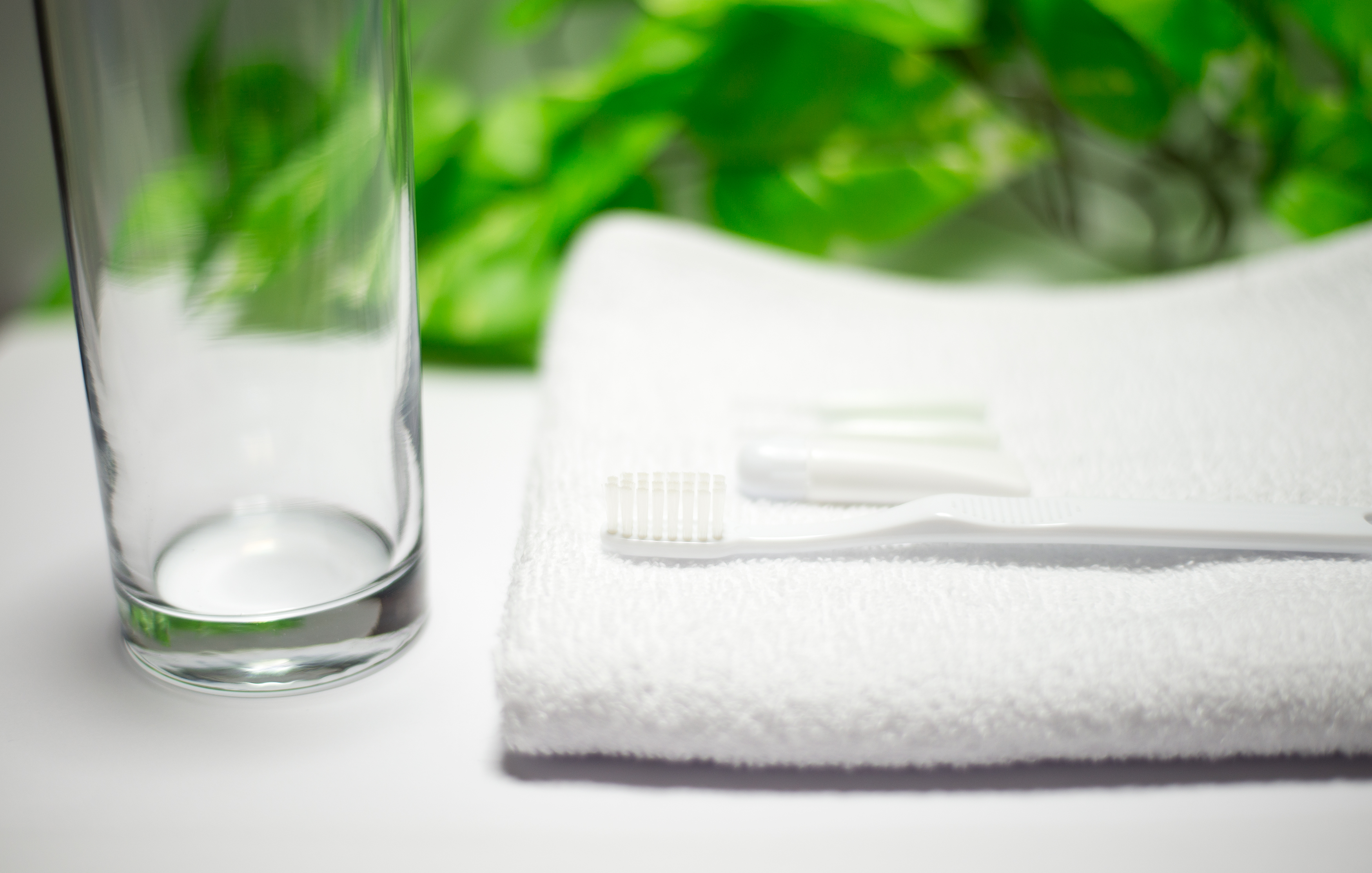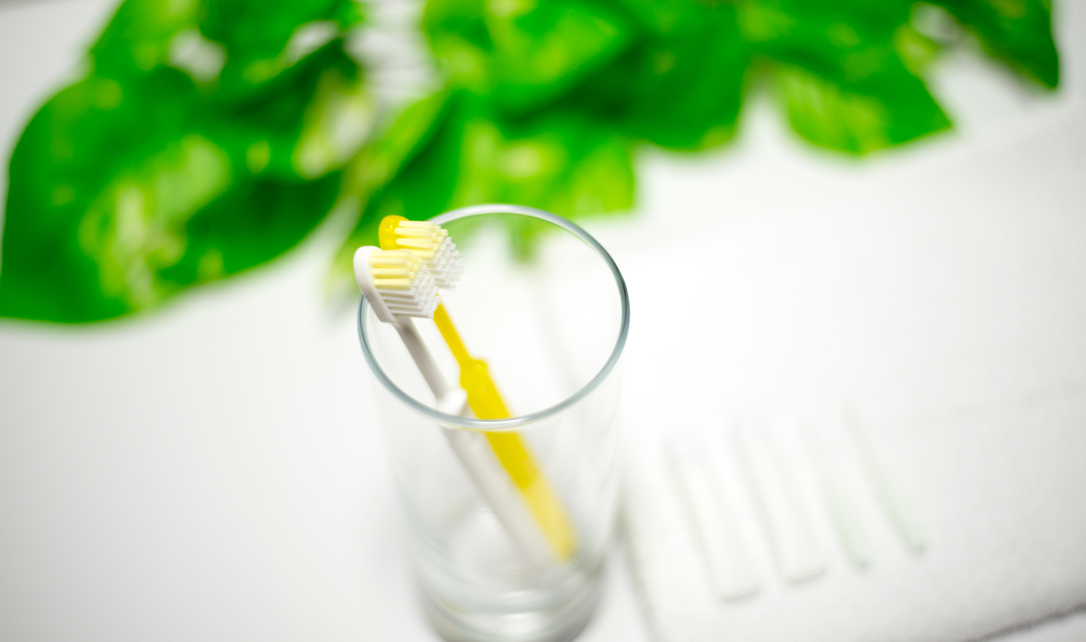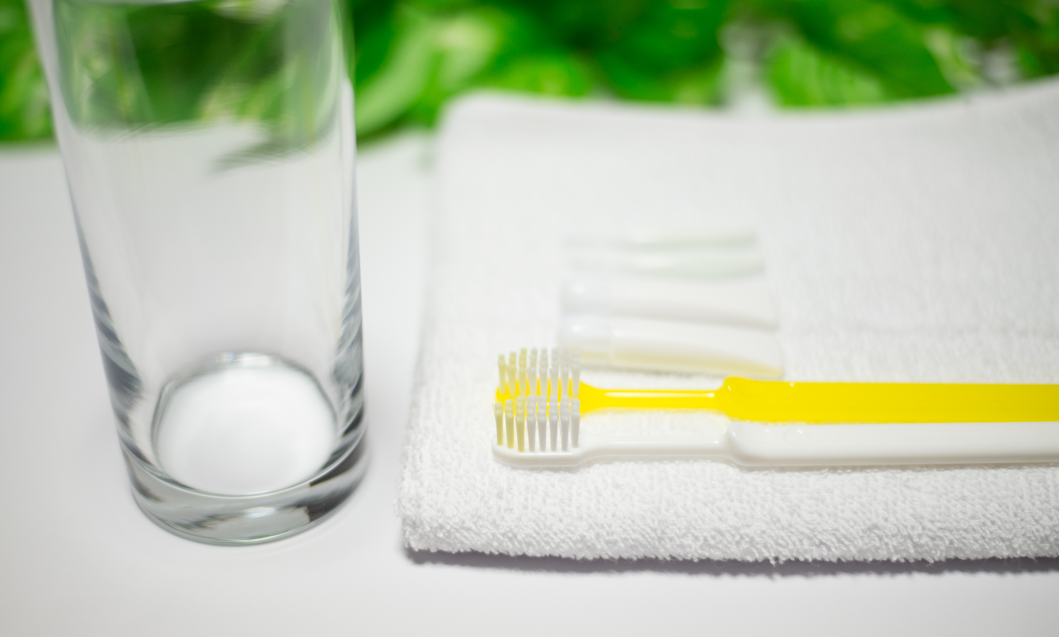 白いタオルの上に、歯ブラシと歯みがき粉と歯間ブラシを2セット置いて、単焦点レンズで撮影しました。