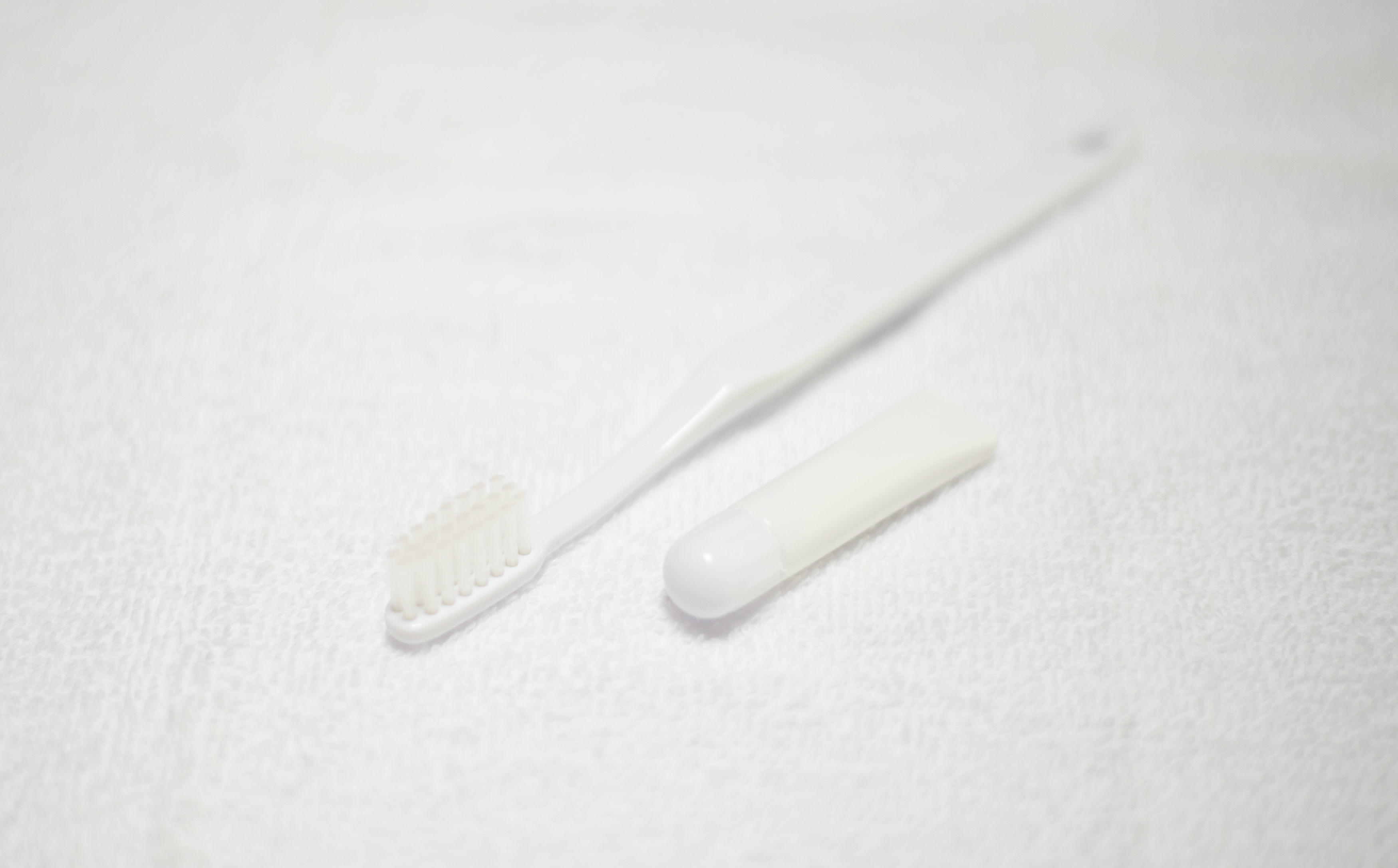 白いタオルの上に歯ブラシと歯みがき粉を置いて、単焦点レンズで撮影しました。