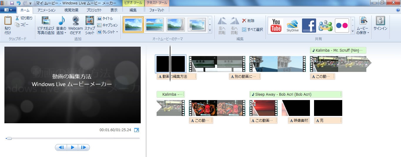 スライドショーの作り方に続いて、Windows Live ムービー メーカー 2011 を使って複数の動画を編集したいと思います。