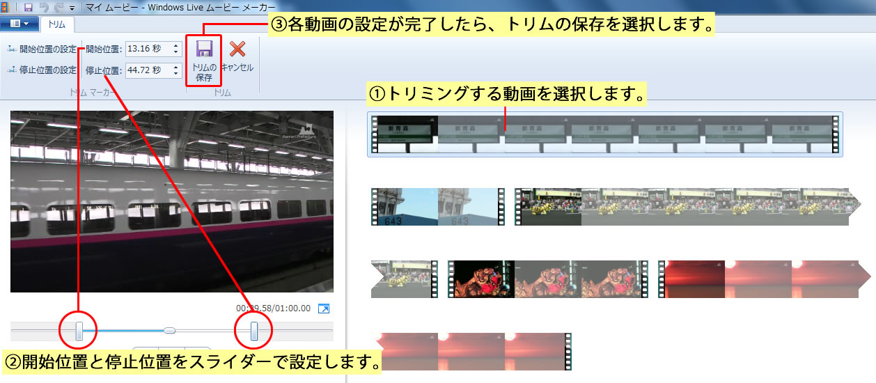 動画を選択して、開始位置と停止位置を選択するという操作を繰り返します。