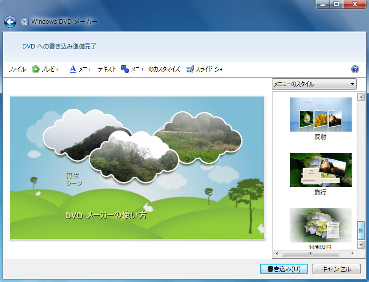 特にカスタマイズしたい点がなければそのまま書き込みを実行することもできますが、DVD への書き込み準備完了の画面では、メニューのスタイルの選択やカスタマイズを行うことができます。