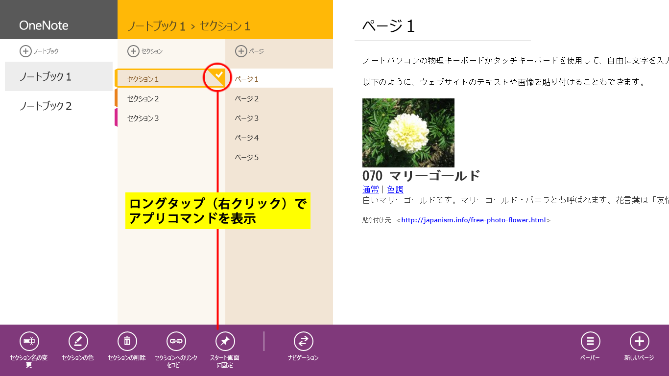 ノートブック/セクション/ページをロングタップ(右クリック)すると、それぞれのアプリコマンドが表示されます。