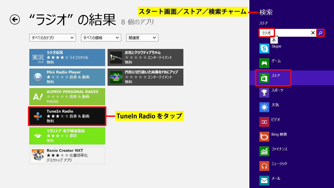 スタート画面/ストア/検索チャームをタップ(クリック)します。
