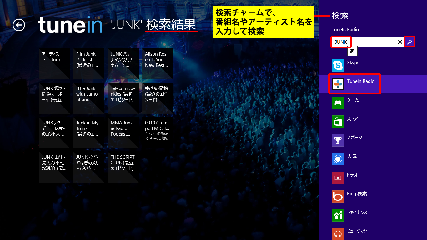 Windows 8 用 TuneIn Radio アプリの使い方です。